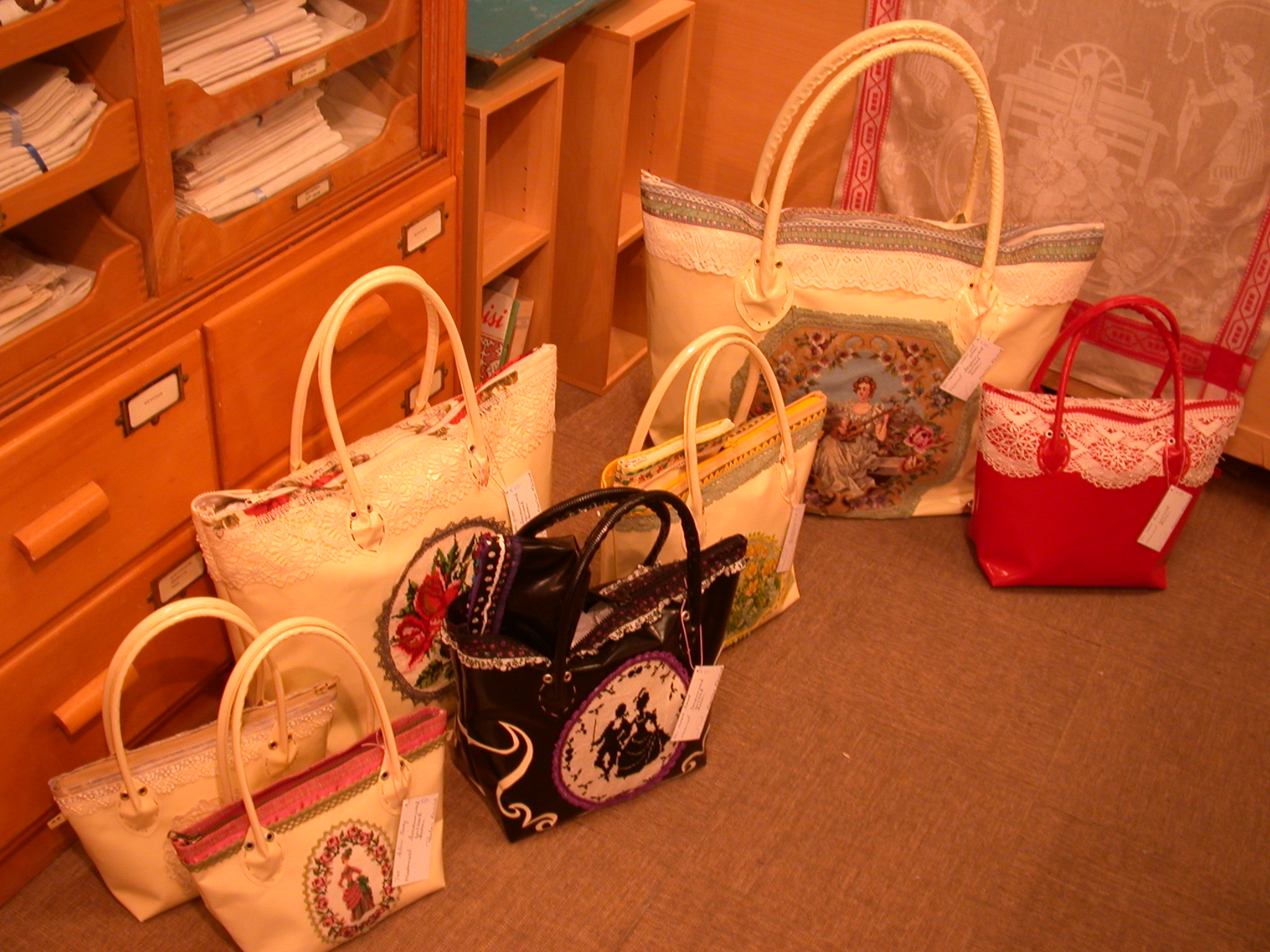 Zij heeft in mijn winkel een keuze gemaakt uit antieke kanten kleedjes, borduursels, randjes en bandjes en die verwerkt in moderne, vlotte en vrolijke tassen. Zo komt het statussymbool van de vrouw van vroeger, het linnengoed, mooi op straat te pronk in het statussymbool van de vrouw van nu: De Tas. Zat de vrouw vroeger thuis te genieten van de fraaie stapels linnen in haar kabinet, nu is de vrije vrouw buitenshuis en reist zij van hot naar her met Haar Tas aan de schouder. En als op die tas dan ook nog de kanten randjes en kruissteken kleedjes van onze ijverig bordurende oma’s te zien zijn, vind ik dat geweldig. Let op het borduurwerk aan de rechterkant, daar is een bijzonder grote reistas van gemaakt, waar je zo mee op Schiphol wilt flaneren. Elke keer als ik naar de tassen kijk, die Paulien vandaag gebracht heeft, schiet ik in de lach. Zo vrolijk. En iedere keer als ik naar de mooie dozen van Lieke kijk, raak ik ontroerd door de schoonheid er van. Enfin, u kunt het vanaf 1 april in de nieuwe winkel zelf eens komen bekijken.