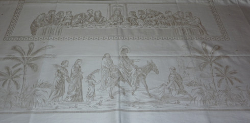 Vandaag is het Palmpasen, de viering van de intocht in Jeruzalem. In mijn winkel heb ik heel bijzonder Avondmaaldamast te koop. In het damasten tafellaken zijn verschillende episoden uit het leven van Jezus zeer gedetailleerd geweven. Palmpasen is te zien in de randen van het tafellaken. Jezus zit op een ezel, terwijl een man kleding op de grond spreidt en mensen met palmtakken zwaaien.